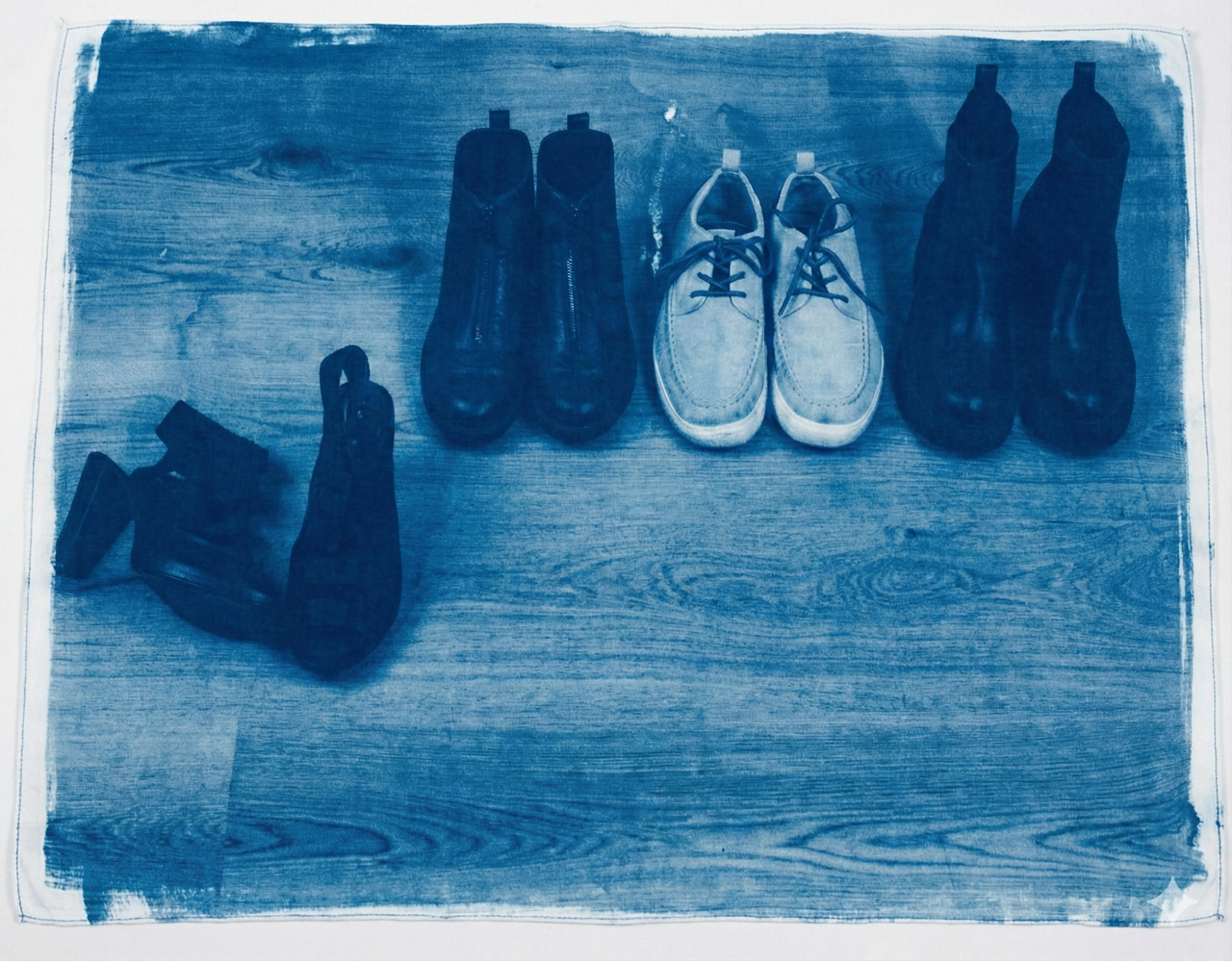 I print portraits onto dupattas and give them to the women photographed. UV light develops the cyanotype; continued exposure fades it. Women in public life watch themselves dissolve. Women who stay indoors preserve the image, but intact for whom? The photograph lives against the skin of the person it records.
